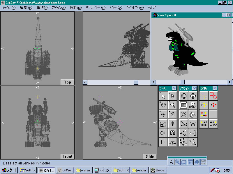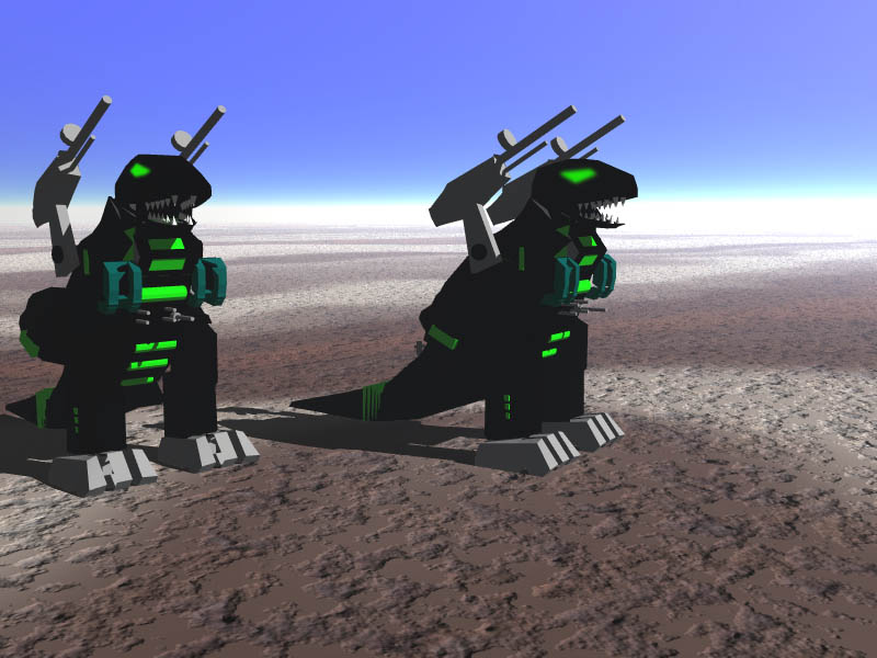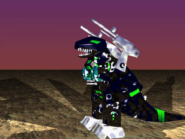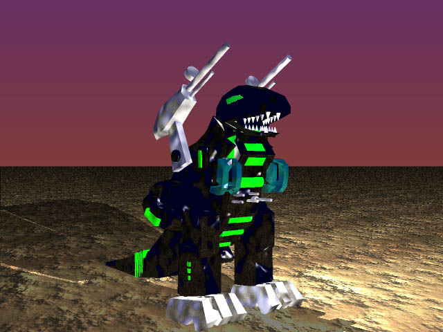 今回はCGデッドボーダーを軽く動かしてみました。ポリゴンに動きを確認しつつジョイントと呼ばれる骨みたいなものを入れていきます。これが結構めんどうくさい上に難しい。ちょっと狂うと飛んでもない動きになってしまいます。今回は稼動個所をすべて動かしてみました。だから歩いている動作をしているわけではないので動きはめちゃくちゃです。なんか苦しんでいるようにも見えますが気にしないでください。そういえばこいつ(デッドボーダー)って尻尾動きましたっけ?もってはいますが電池を入れて動かしたことがないのでわからないのですが・・・まあ実物が動かなかろうが動こうがいいや、本来できないことをさせる事ができるのもCGのいいところなのです、容量は158KBです。 psちなみに動きはお遅めにしてあります。 |