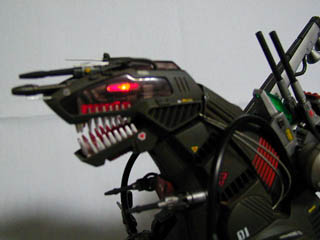 | 改造ポイント | 本体は銃口の開口と頭部のディテールアップをした程度です。ブースターバックは旧改造セットのパーツを改造して取りつけています。頭部クリアパーツはジャンクの旧デスから流用しました。塗装は黒下地→基本色→ウォッシング→ドライブラシ→デカール→クリアコートで行いました。デカールのゼネバスマークはWHFの改造コンテストの参加賞から流用です。ライトをLEDに変え、スイッチを別に取り付けたので動力と独立して点灯させることができます。 | ||